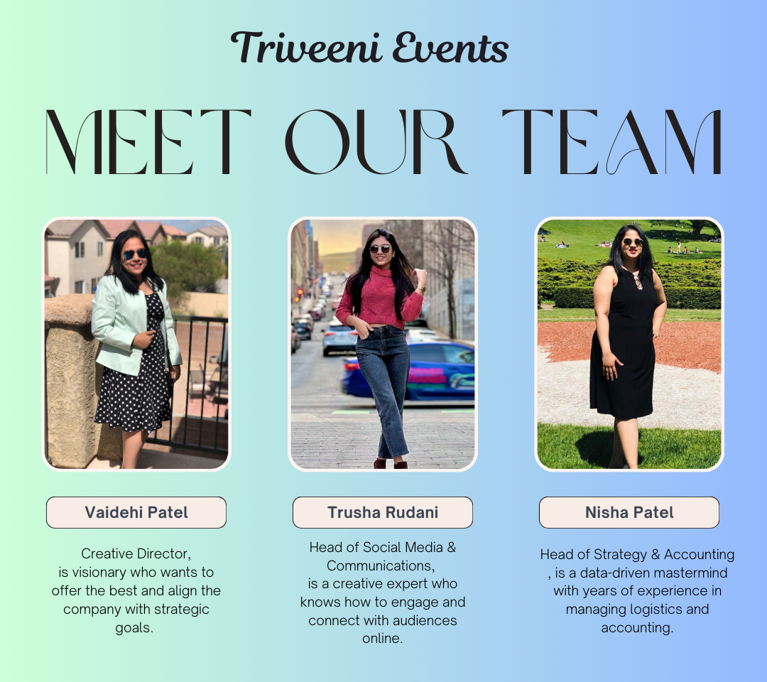 Triveeni Events is an event company launched in 2024 by 3 vibrant, passionate and ambitious immigrant women, who wishes to showcase the best of Indian and Canadian cultures and to make a memorable place in their clients’ hearts.